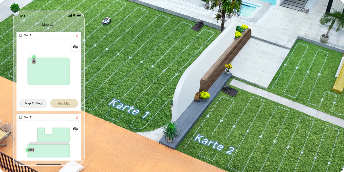 Perfect for properties with separate front and back gardens, the A2 lets you create and manage two independent maps. Set up individual mowing schedules for each area—saving time and eliminating the need for an additional mower. It's also ideal for owners of multiple properties.