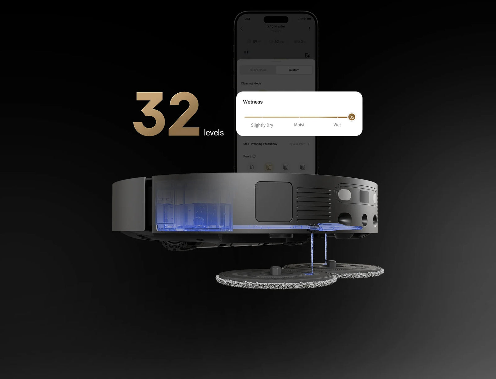 En utilisant le mode aspirateur et vadrouille dans l'application Dreamehome, vous pouvez facilement définir votre mode de vadrouille préféré de légèrement sec à humide à mouillé. Après l'essuyage, le capteur de couleur détecte l'eau sale et ajuste la quantité d'eau dans la vadrouille (32 niveaux) pour les zones très sales.
