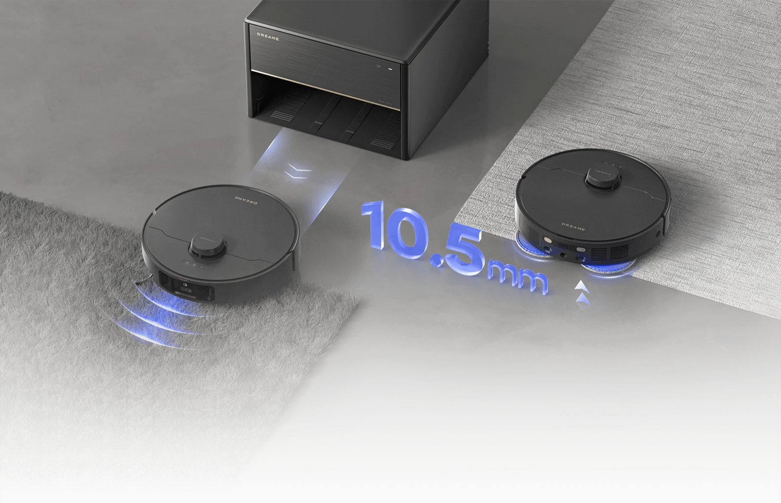 10,5 mm : La différence de hauteur du robot aspirateur avant et après avoir soulevé la vadrouille est de 10,5 mm. Pour les tapis ayant un poil supérieur à 5 mm, nous vous recommandons de régler le robot aspirateur via l'application Dreamehome pour retirer les serpillères, afin que vos tapis soient protégés de l'humidité.