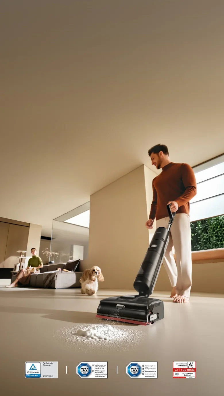 * 100%ige Entfernung: Basierend auf Tests des TÜV SÜD (China) Shanghai (Bericht-Nr.: 704012501118-00) erreichte der H15 Pro FoamWash unter Laborbedingungen eine Reinigungseffizienz von 100 % bei von Haustieren verursachten Urinflecken, gemischten Verschmutzungen und Kaffeeflecken. Die tatsächlichen Ergebnisse können je nach Nutzungsgewohnheiten und Umgebung variieren.