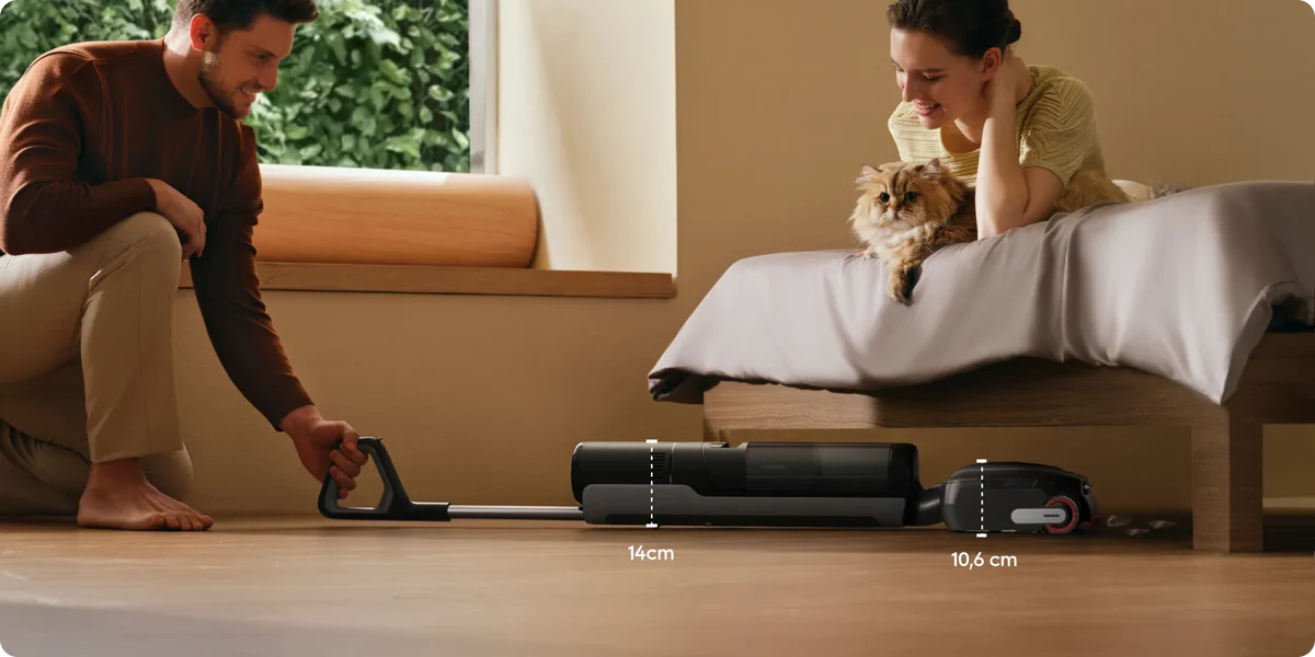 Der H15 Pro FoamWash lässt sich um volle 180°* neigen und gelangt so mühelos unter Sofas und niedrige Möbel. Der Schmutzwasserbehälter fängt gebrauchtes Wasser sicher auf und schützt so den Motor, während er mit seiner starken Saugkraft von bis 23.000 Pa selbst die engsten Stellen reinigt.