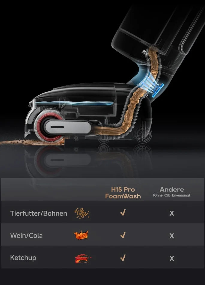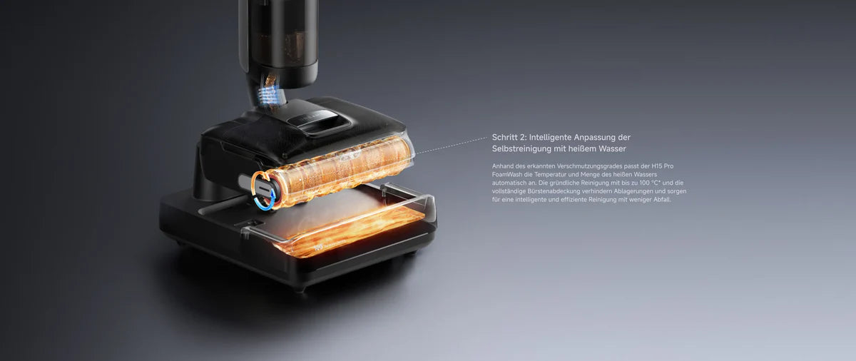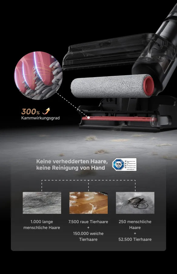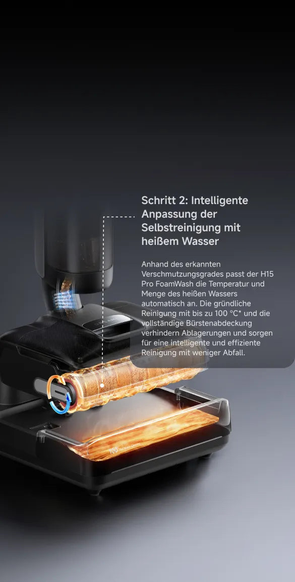 * 100 % verhedderungsfrei: Der H15 Pro FoamWash entfernte ca. 1.000 lange Menschenhaare, 7.500 grobe Tierhaare, 150.000 weiche Tierhaare oder 250 Menschenhaare bzw. 52.500 Tierhaare ohne Verheddern. Basierend auf Tests des TÜV SÜD (China), Shanghai. Bericht-Nr.: 704012501119-01. Die tatsächliche Leistung kann abweichen.