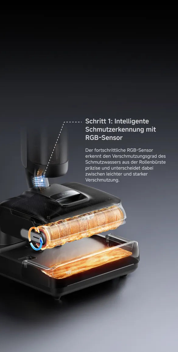 * 5-mal empfindlicher: Basierend auf unseren internen Labordaten ist die RGB-Schmutzerkennung 5-mal empfindlicher und kann im Vergleich zur thermischen Erkennung, die bei älteren Modellen zur Anwendung kommt, oder zur Schmutzerkennung per blauem Licht, die andere Marken nutzen, eine Vielzahl von Schmutz- und Fleckenarten erkennen.