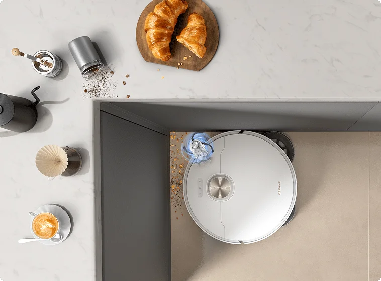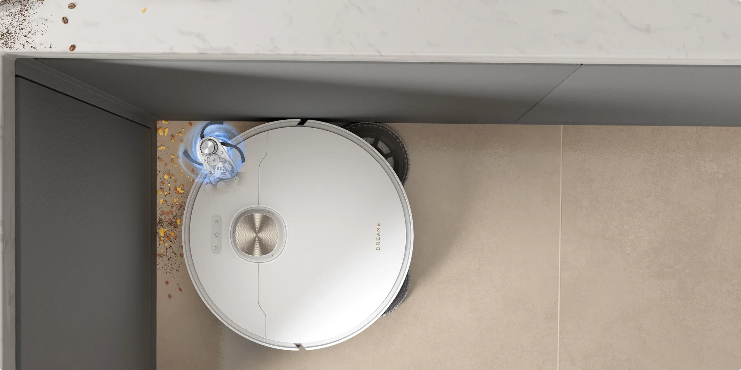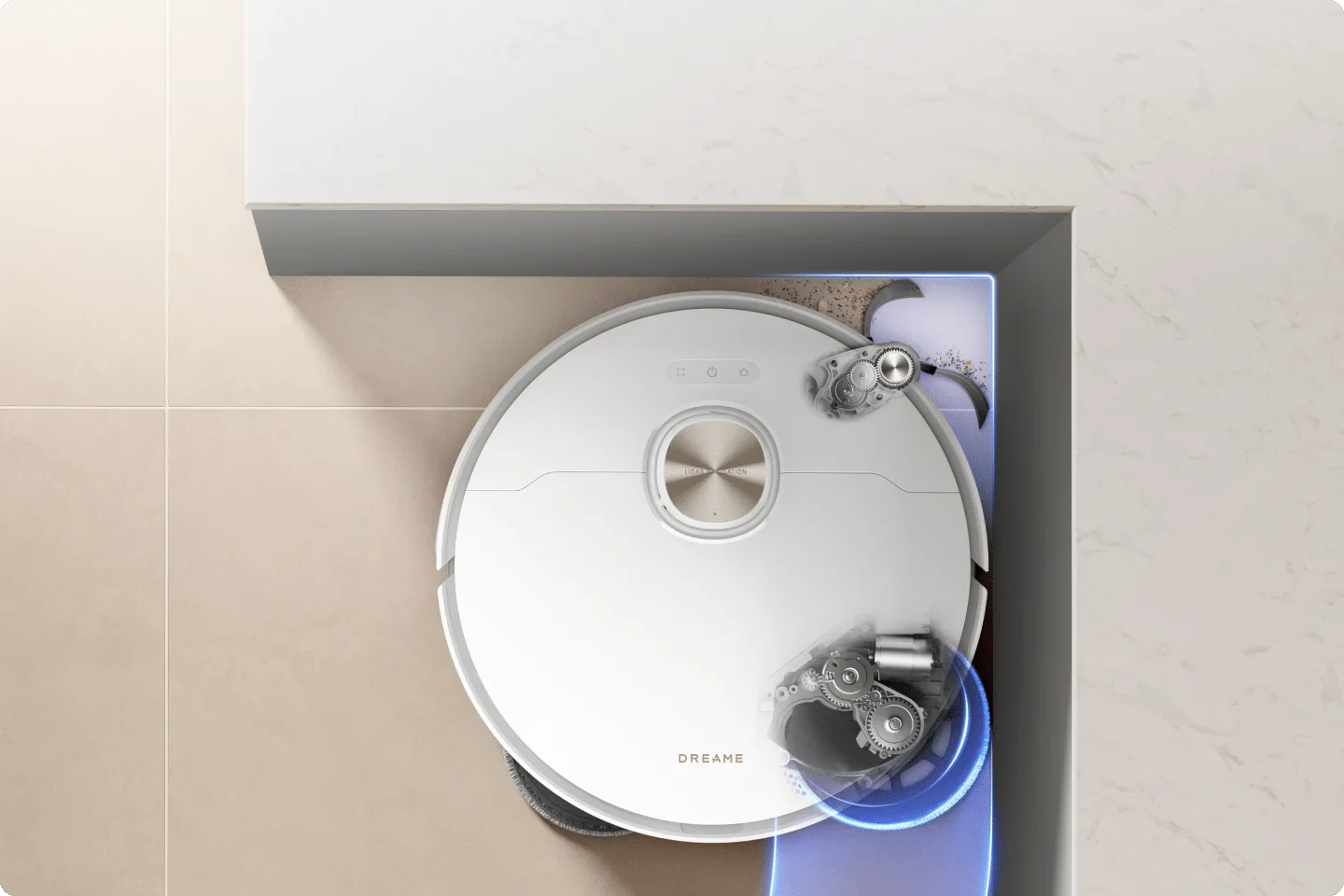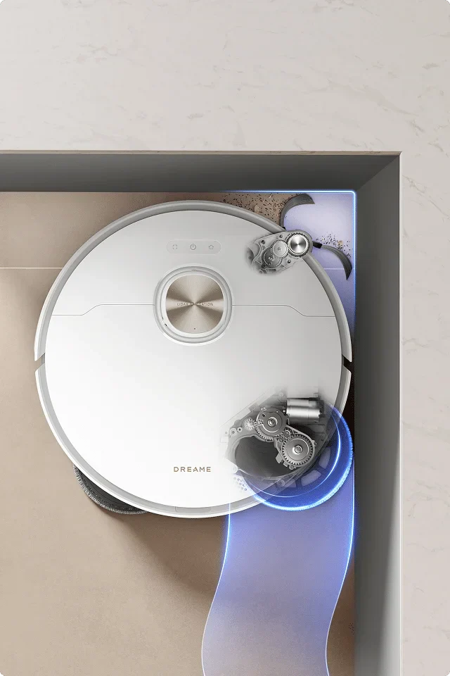 Die Seitenbürste fährt automatisch aus, um Ecken und Kanten zu erreichen und Schmutz aus engen Zwischenräumen zu entfernen, um eine umfassende Abdeckung zu gewährleisten.
