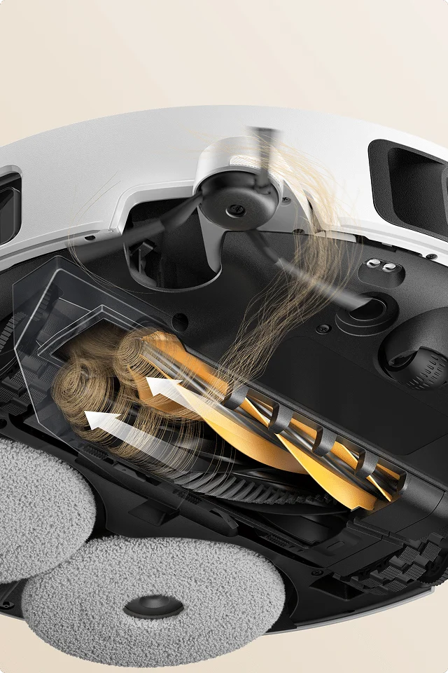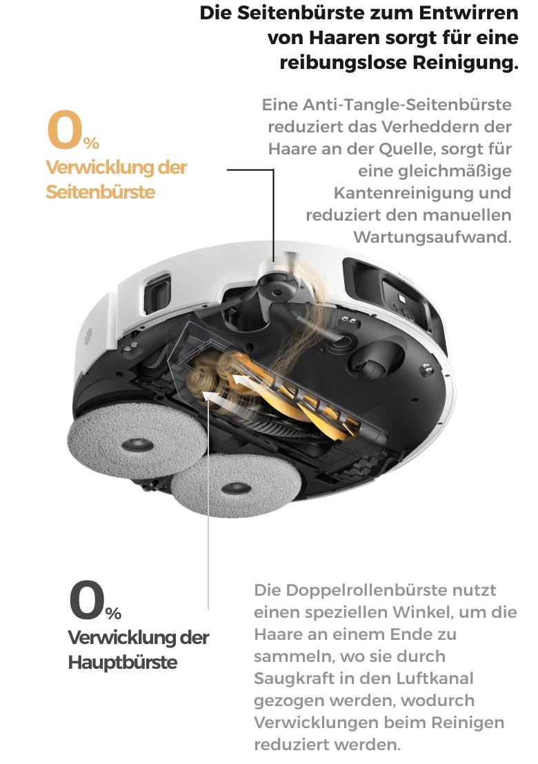Die Doppelbürsten beseitigen Haare von Böden und Teppichen und sorgen zugleich für eine gleichmäßige Saugleistung, wodurch Verwicklungen reduziert werden und eine leisere, effiziente Reinigung der Oberfläche erzielt wird.