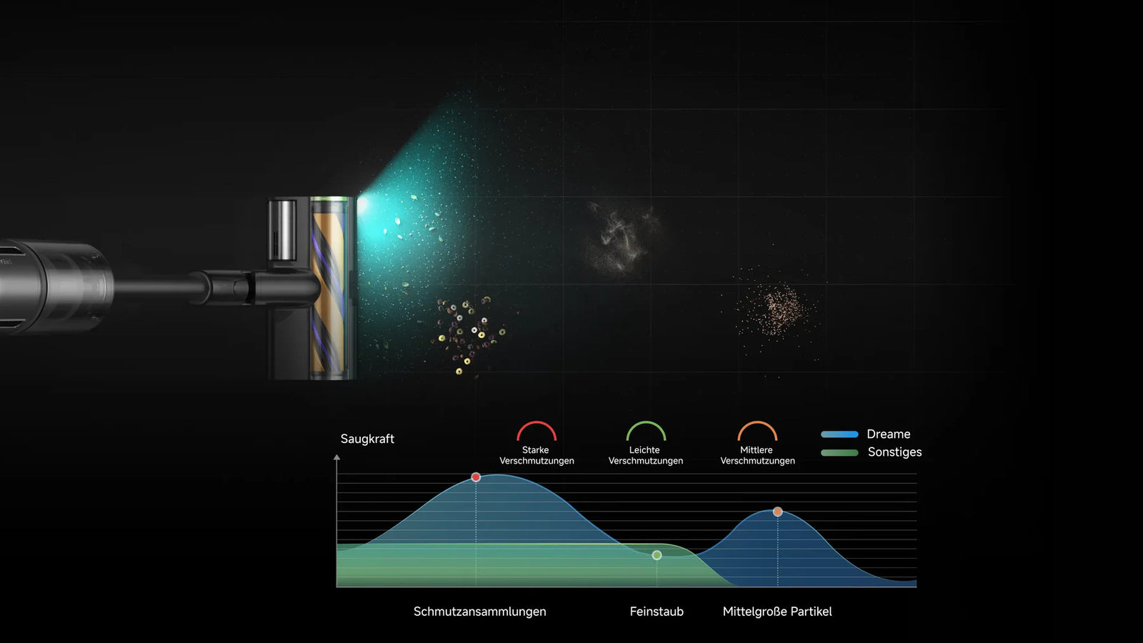*310 AW, 150.000 U/min: Laut unseren internen Labordaten, die tatsächliche Leistung kann abweichen. Die 310-AW-Saugleistung stellt den höchsten Wert innerhalb der Produktpalette der Akku-Stabstaubsauger von Dreame dar (Stand: Mai 2024).